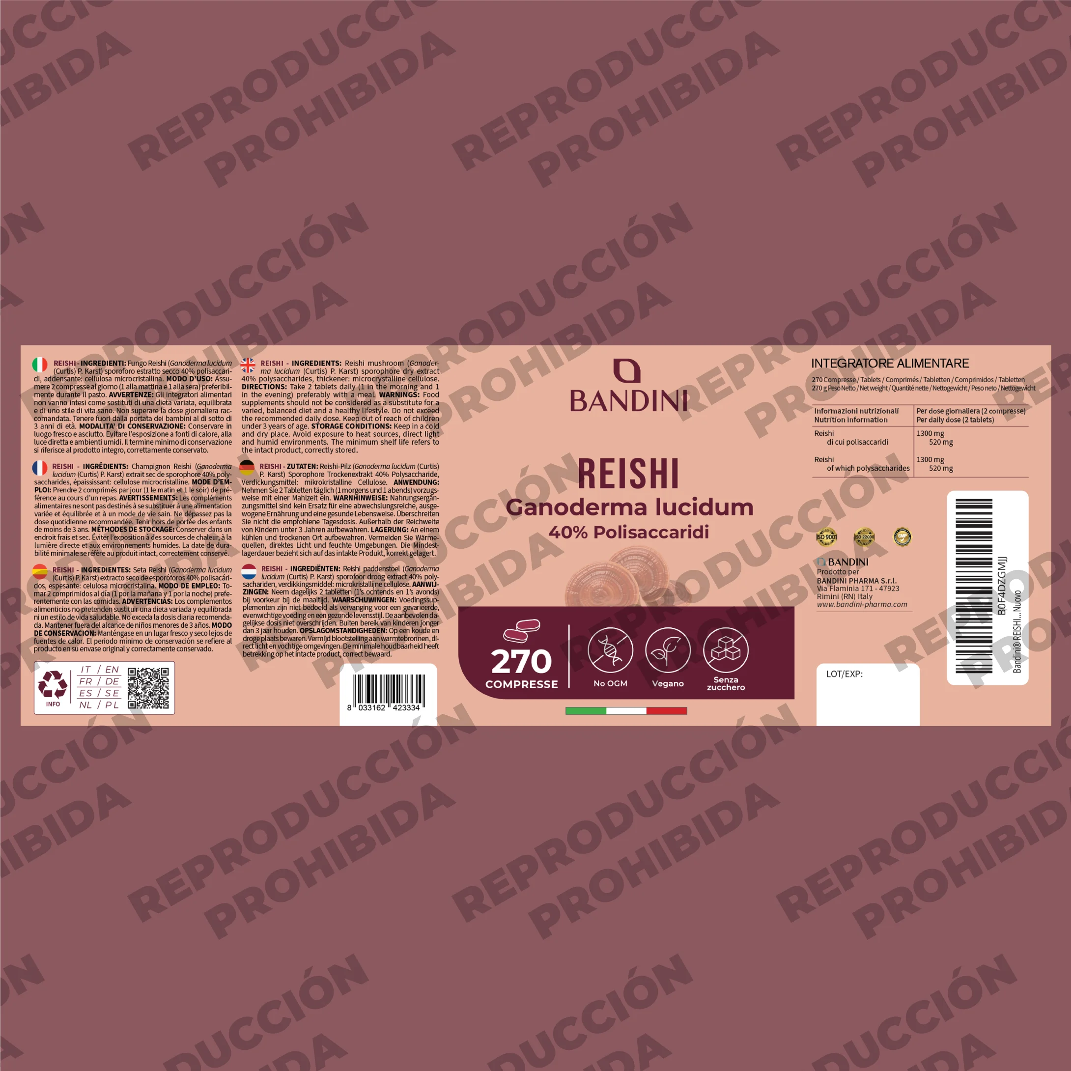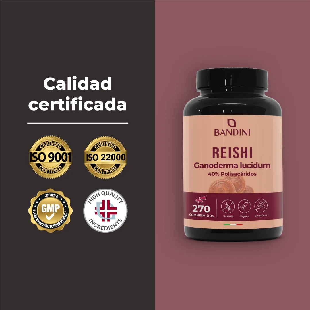 Reishi es un complemento alimenticio a base de extracto seco del hongo Ganoderma Lucidum.