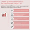 La vitamina B12 contribuye a reducir el cansancio y la fatiga. La riboflavina (vitamina B2) favorece el metabolismo energético normal. La niacina (vitamina B3) contribuye al funcionamiento normal del cerebro. El ácido pantoténico (vitamina B5) contribuye al rendimiento físico normal. La biotina (vitamina B7) contribuye al mantenimiento de la piel y el cabello en condiciones normales. El folato (vitamina B9 ácido fólico) contribuye a una función inmunitaria normal.