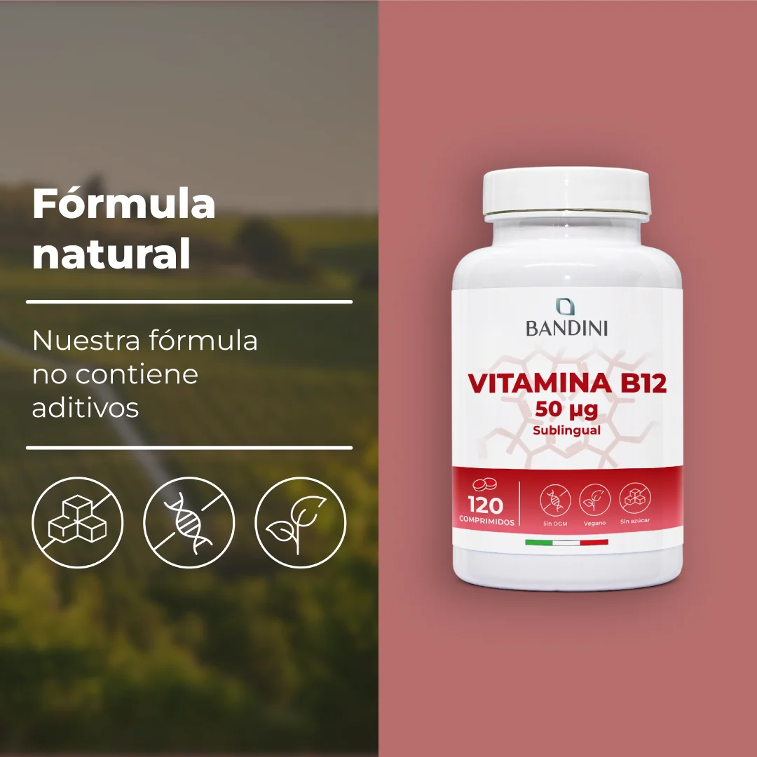 Suplemento dietético de alta dosis con 50 mcg de vitamina B12 por comprimido. La dosis diaria es de 1 comprimido. Práctico envase de 120 comprimidos masticables para 4 meses de cobertura.
