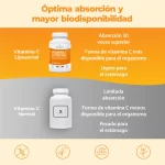 La vitamina C contribuye al funcionamiento normal del sistema inmunológico, al metabolismo energético, a la protección de las células frente al estrés oxidativo, a la formación normal de colágeno, al funcionamiento del sistema nervioso y a la reducción del cansancio y la fatiga.